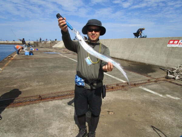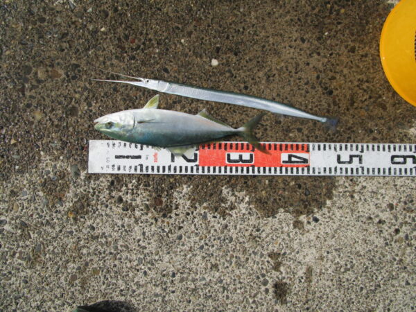 安全設備設置後 10時開放となりました 早朝は波浪注意報が出ており うねりがありましたが 落ち着いてきました 昨年まで釣れていなかったオキザヨリは 今年はよく釣れています 水温の関係だと思いますが 美味しい魚ですので 是非賞味ください