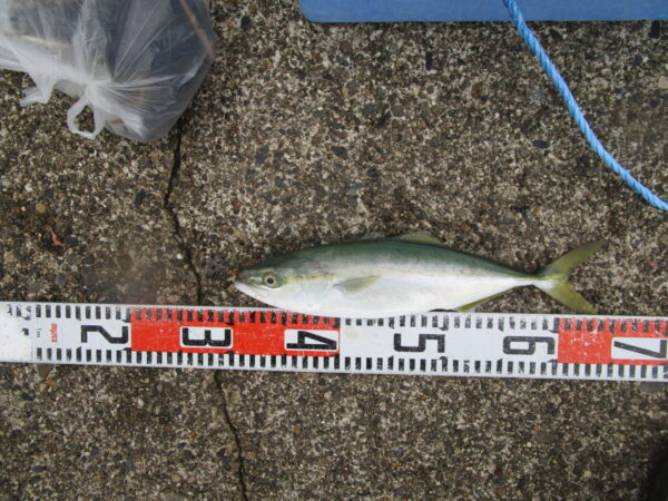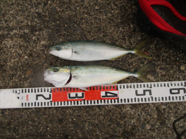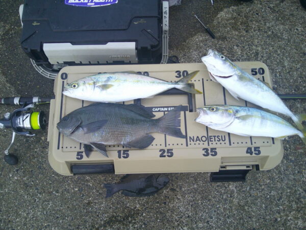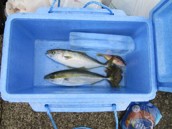 650m外側 ワカシ3匹 ~35cm 泳がせ釣り メジナ30cm サビキ釣り